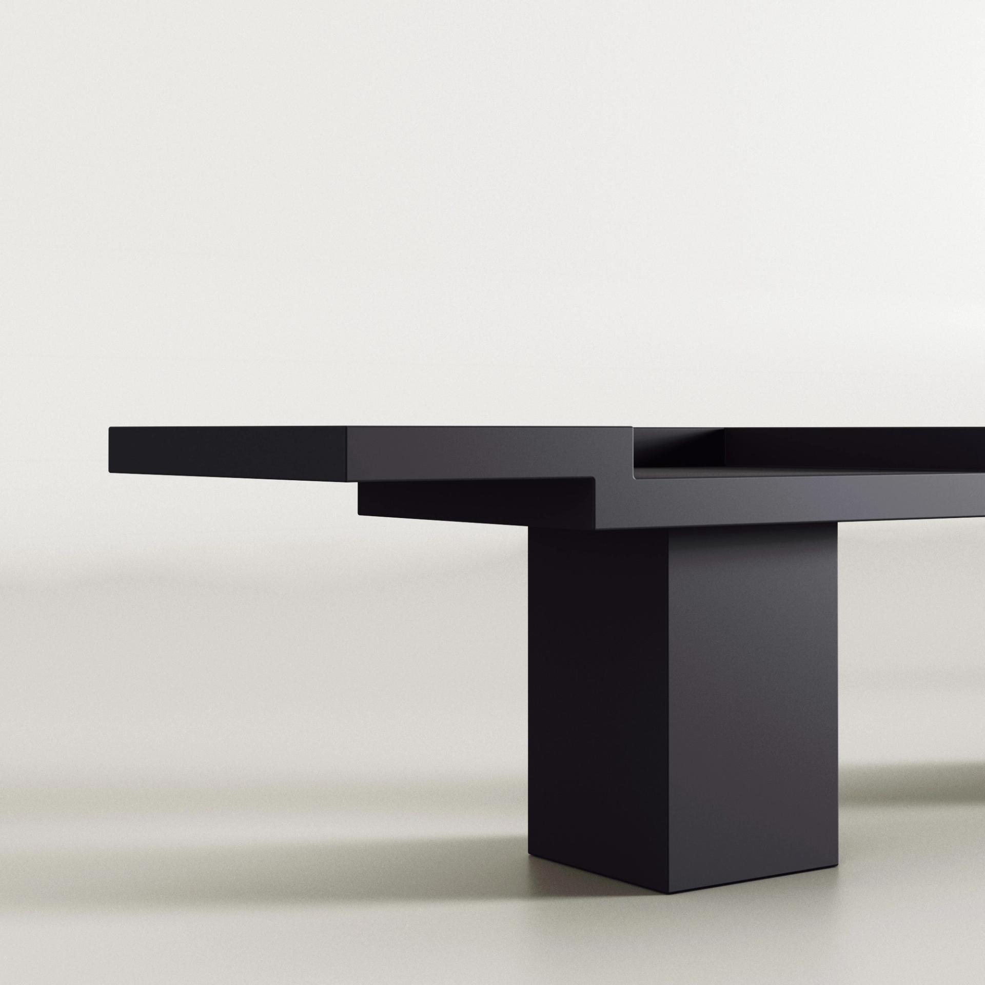 Two–seat bench in lacquered MDF. The piece features strong geometrical shapes forming the seats. Colour variations available upon request.