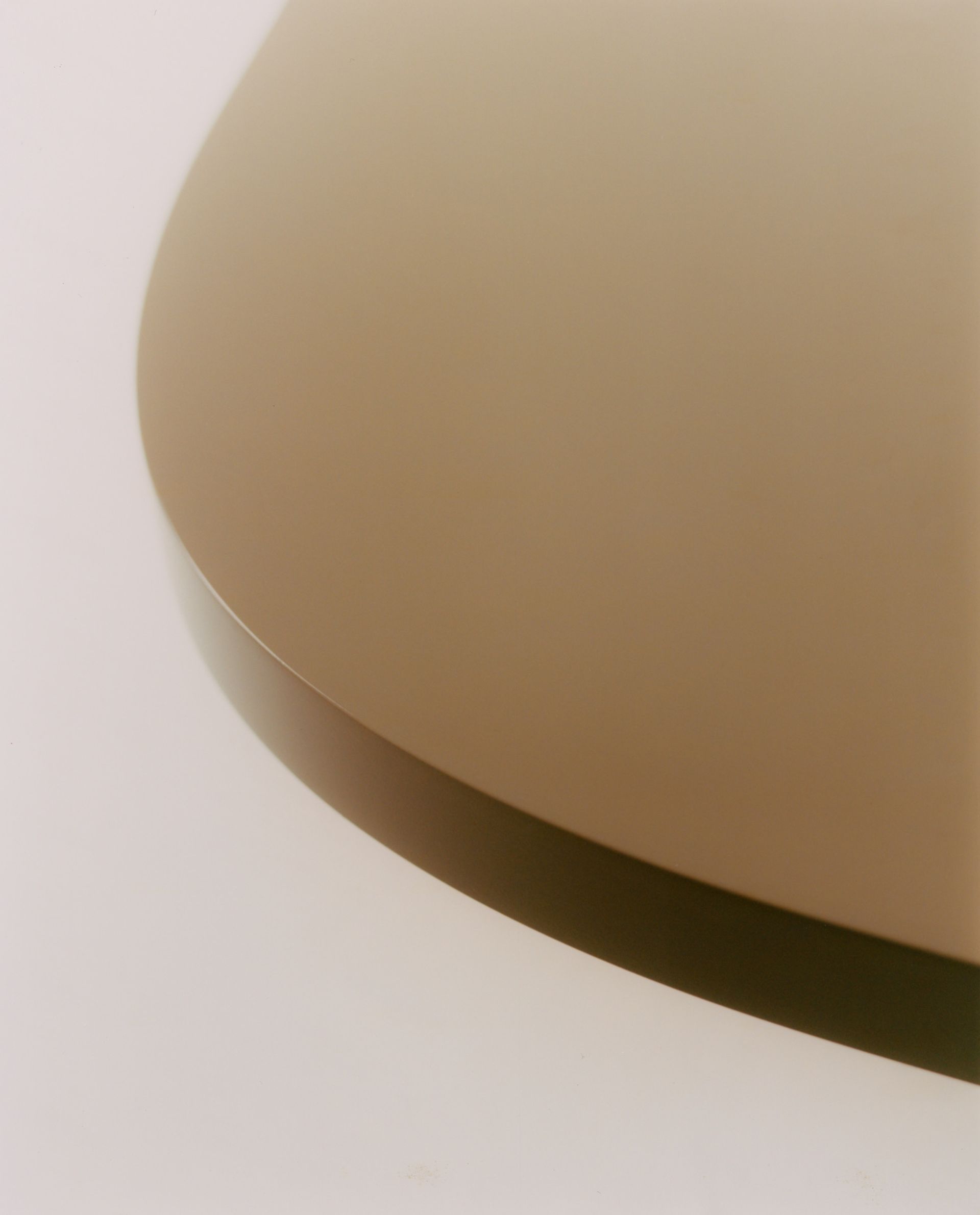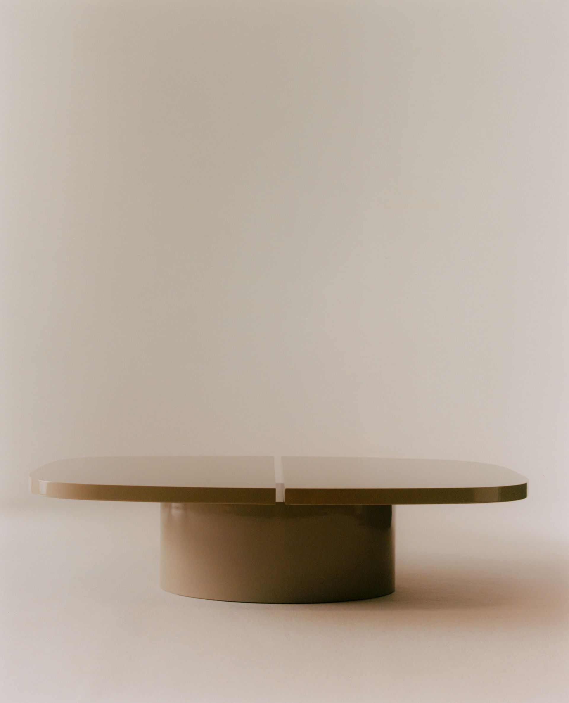 70’s inspired low table in lacquered MDF. Its oval shape in both the leg and top and smooth finishings create a soft visual effect. The top is split in two, positioned on top of one single leg.