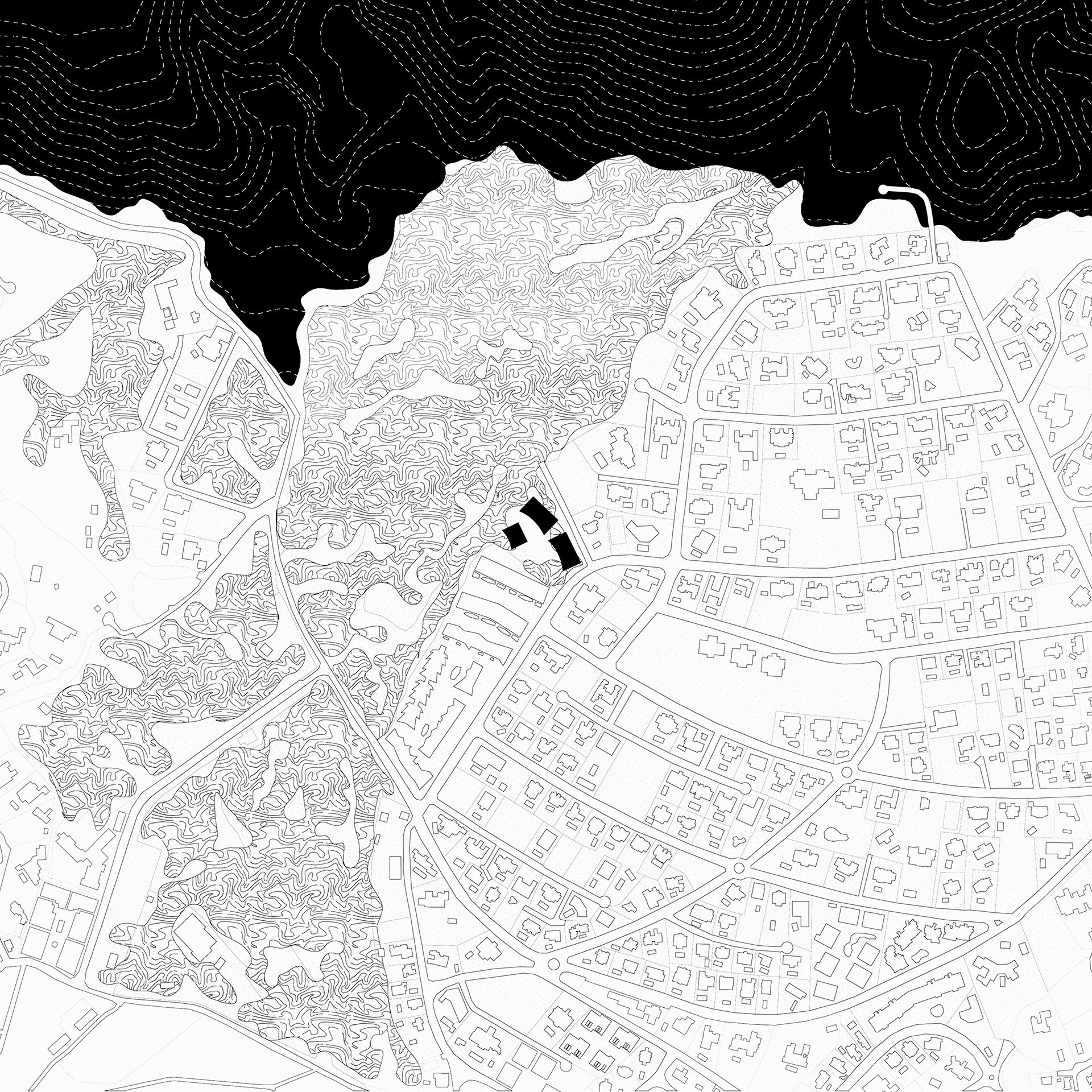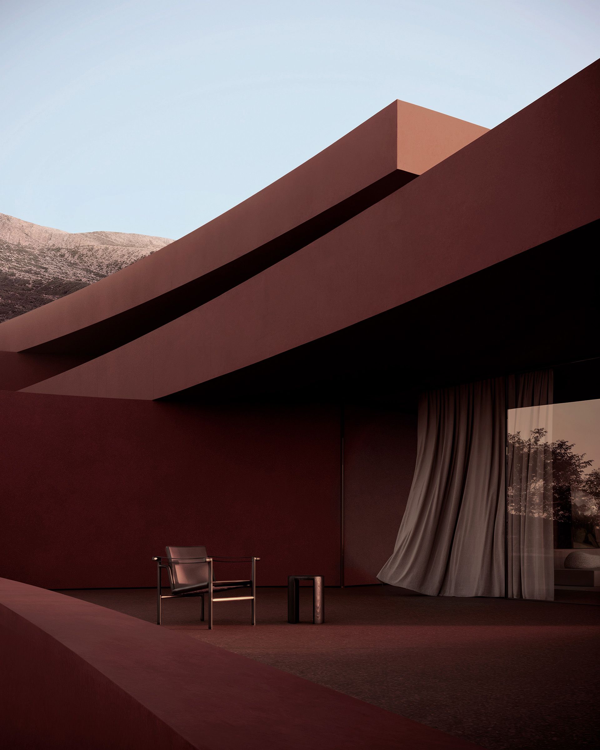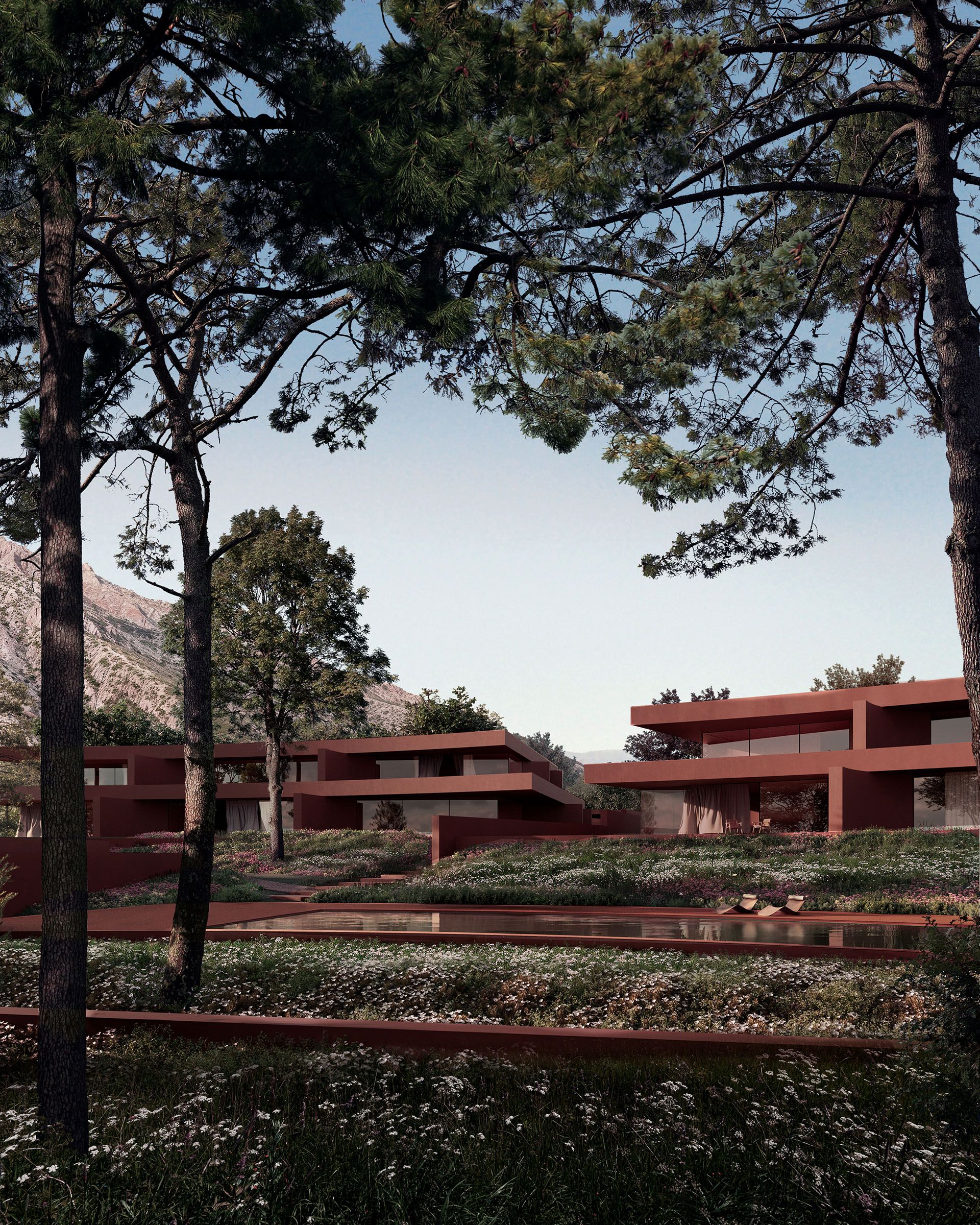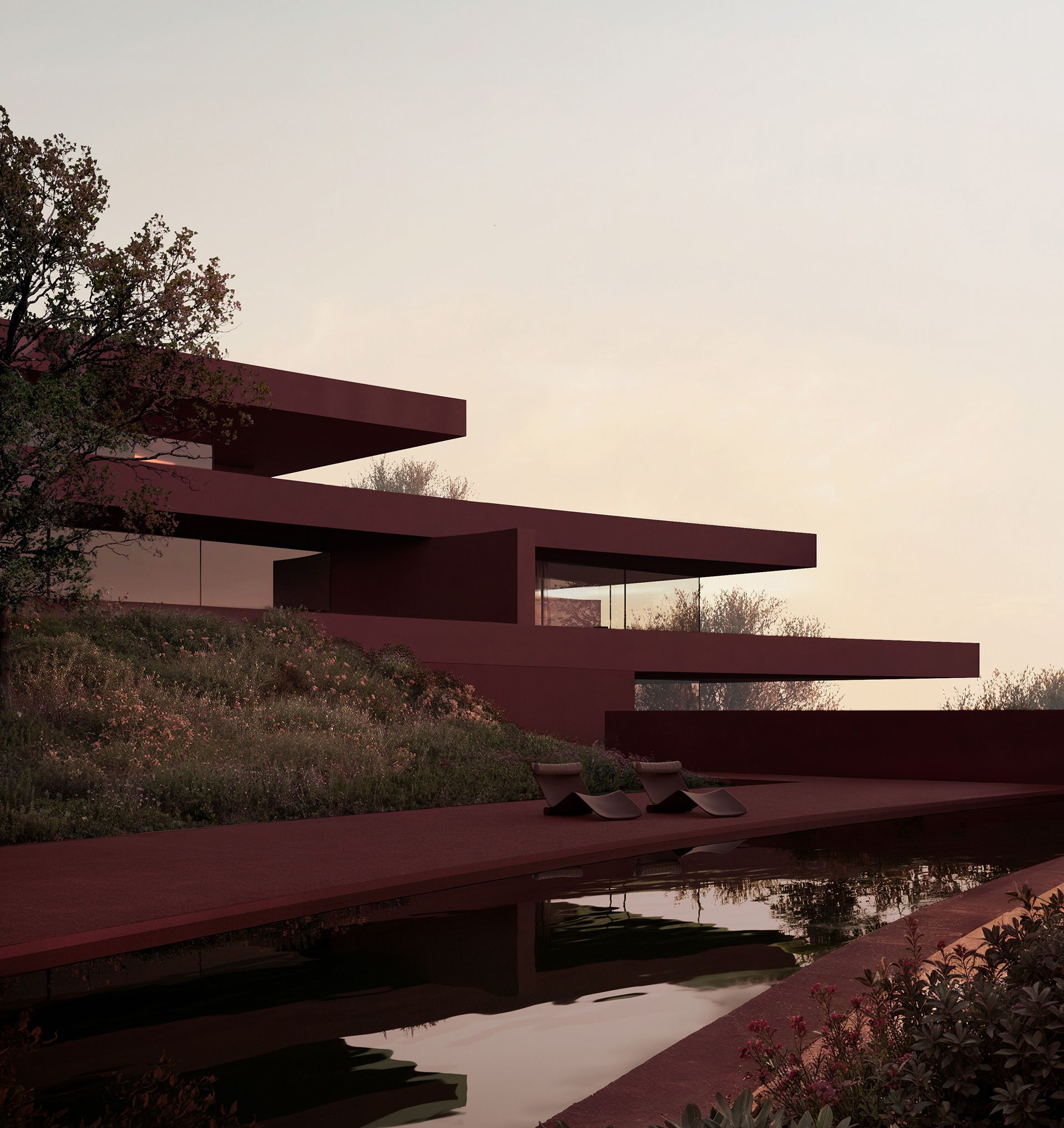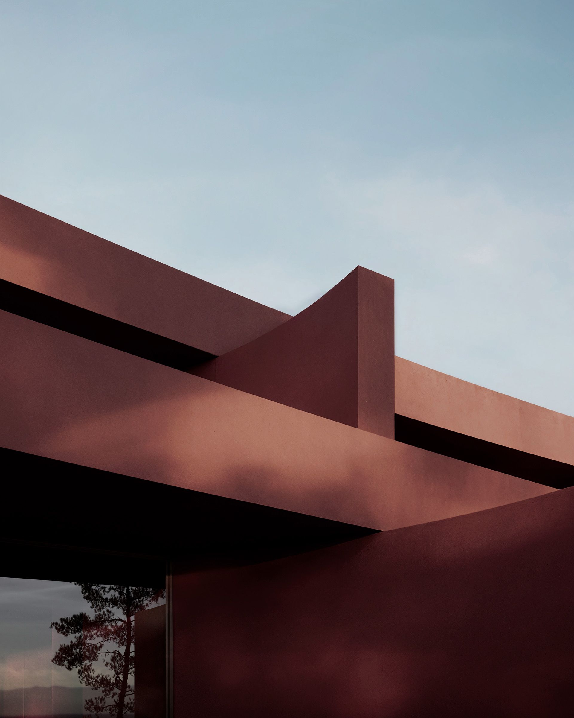 One of the project's main strategies is to mimic these surroundings, taking in the natural colour palette through a de-saturated red tone, a rarity among the adjacent buildings, which all revert to the use of white, reinforcing a more conventional idea of luxury. This decision is backed by the desire to disappear in an environment of relatively high visual noise, which makes the project stand out because it doesn't stand out.