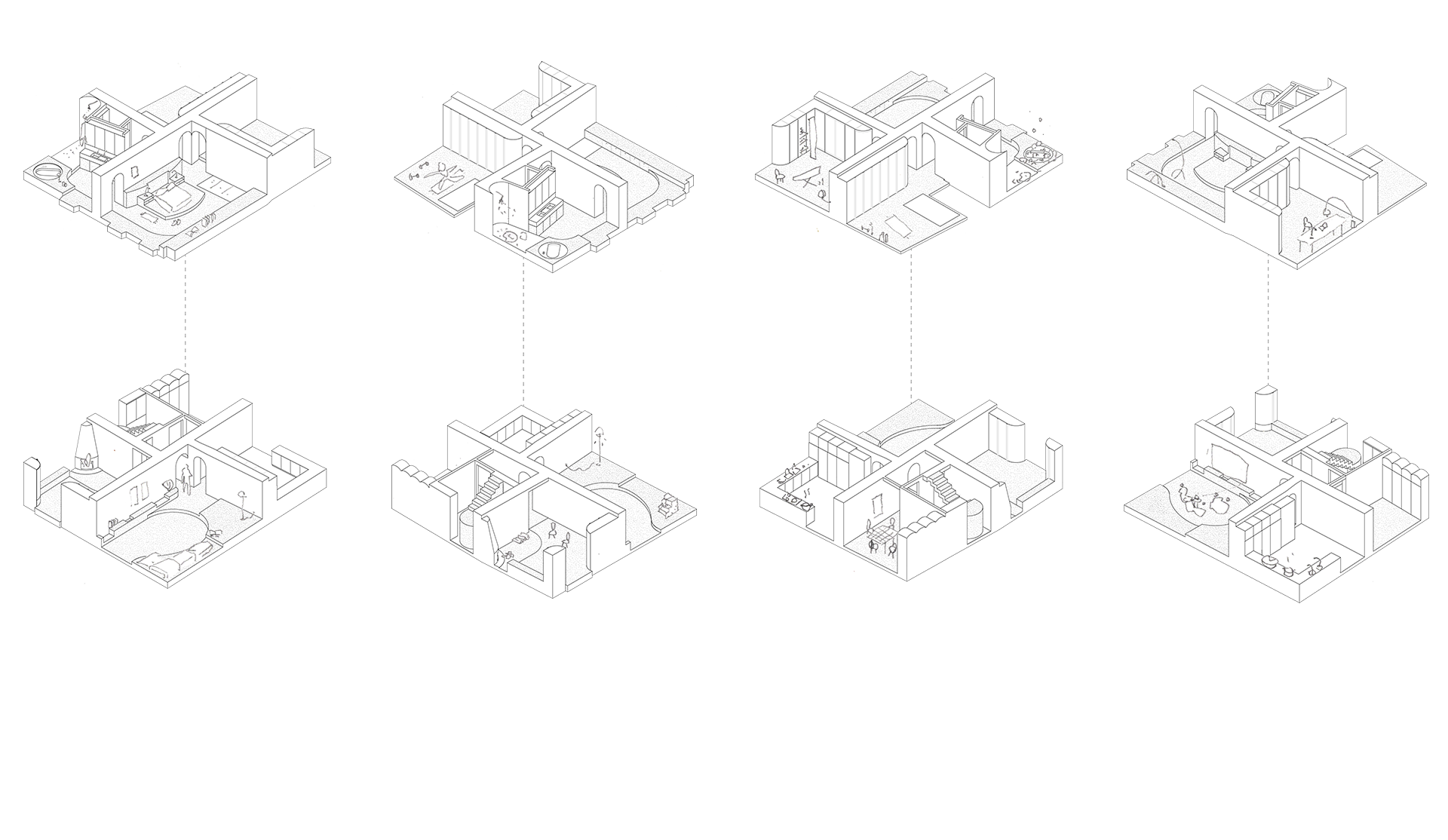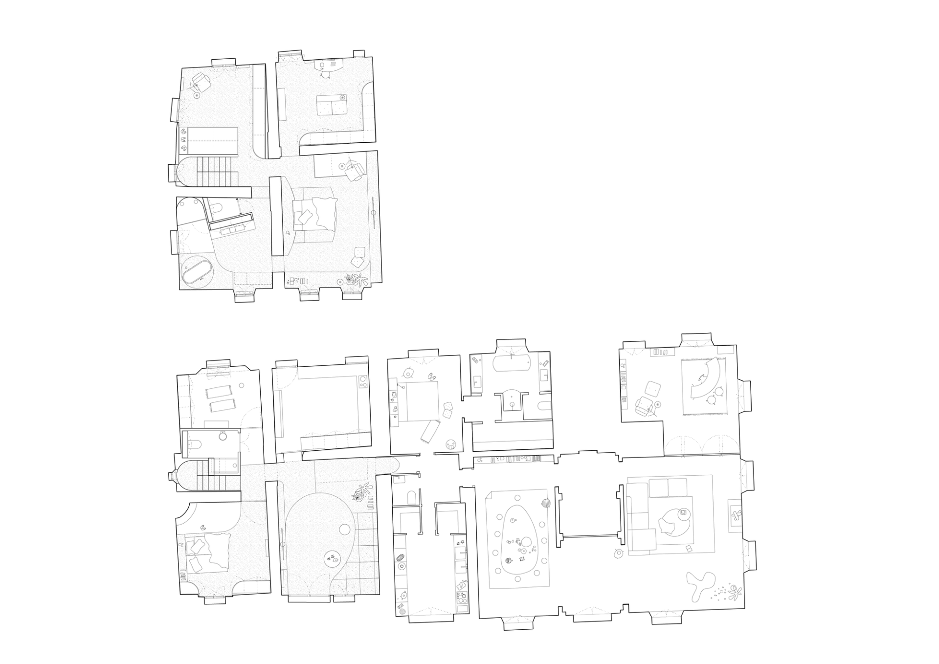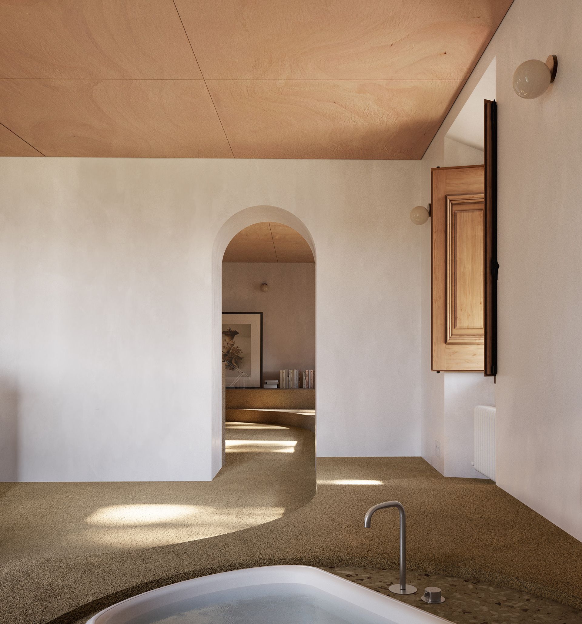 In the previous project, the fundamental decision was to design a large wooden furniture piece running along the entire floor to divide high-ceiling rooms into functional spaces with movable doors. However, this concept is no longer carried forward in the current proposal, seeking a simpler intervention that preserves its key features.
