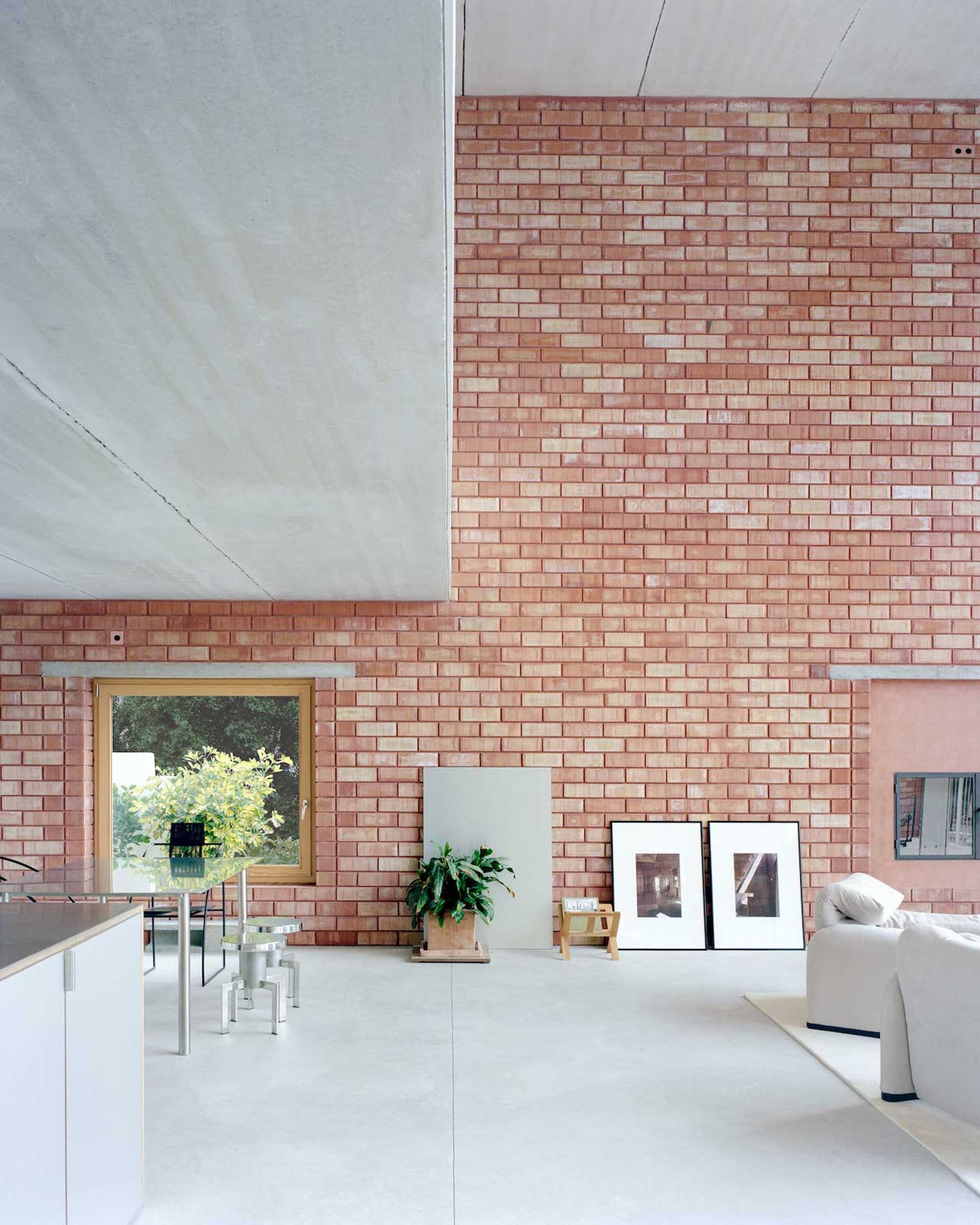 Inside the house, walls are clad in brick from a local quarry to maximize thermal insulation through a thermal insulation chamber. The simple rigging of the brick shows another way of reinterpreting the materials used on the construction site, using a “rope” rigging that understands the vertical cuts of the architectural holes, generating exceptions in the system with the rotation of the same pieces. The sunk terracotta mortar flees from an industrial environment and combines wooden carpentry and non-recessed lights to create a warm atmosphere. The living room is the heart of the house and connects both levels thanks to its double height.