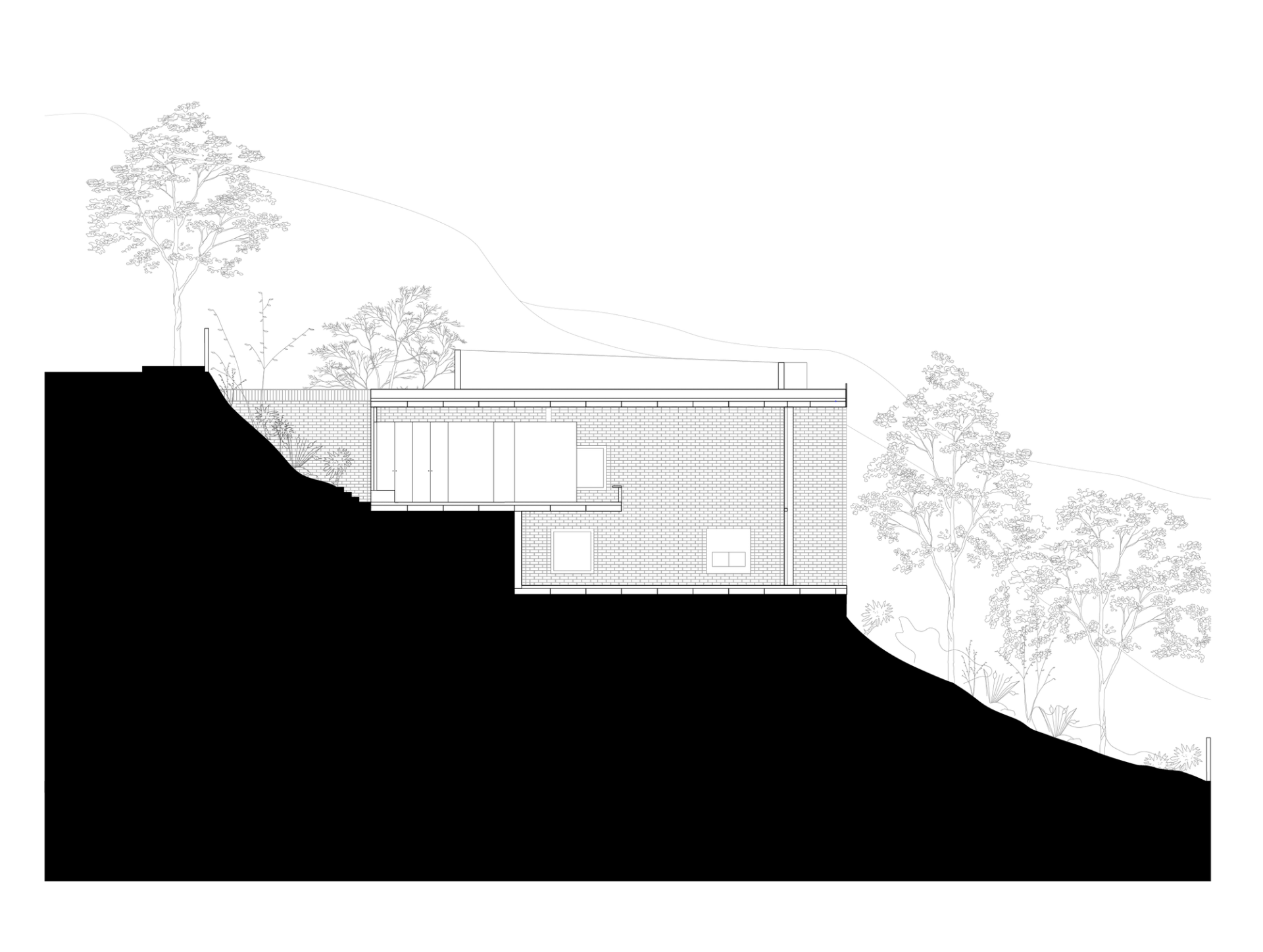 The programme is divided into two staggered levels down the hill, preventing the building from standing out over the street. Two entrances are connected through a staircase along the west wall, while on the opposite front, limited openings control visuals of neighbouring houses. In a radically different attitude, the two other facades open entirely to the outdoors.